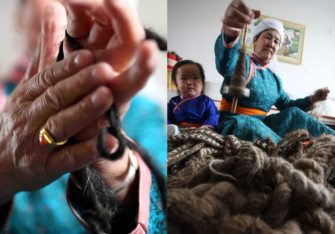 傳統(tǒng)氈繡不僅用于工藝品,大多用在生產(chǎn)生活中。蘇尼特氈繡技藝的繡制首先從制氈開始,大都在夏末秋初進行。材料多為駝絨線,而紡駝絨線則是用駱駝膝蓋絨毛以及駝鬣的細絨手搓而成。