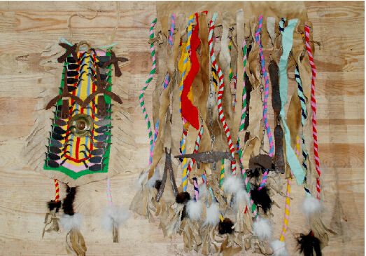 腰裙下擺的前后配戴著50個(gè)銅鈴,以此代表眾多神靈的福音。腰裙上還系著一對(duì)熊神和一對(duì)狼神偶體,因?yàn)槎鯗乜巳苏J(rèn)為熊是人類的祖先,人們不能輕易傷害獵取,如果一旦打死熊,也要對(duì)熊骨進(jìn)行風(fēng)葬。而狼據(jù)說(shuō)是神靈的兒子。這些又都可見(jiàn)薩滿信仰又與鄂溫克人在原始社會(huì)條件下的自然崇拜、祖先崇拜有著非常緊密的淵源關(guān)系。