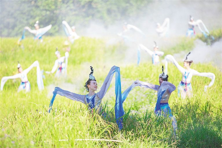 山蘭稻田上演歌舞節(jié)目歡慶豐收。李天平 攝