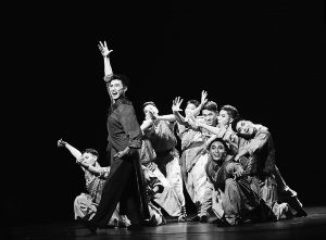 作品第二段,山東快書表演漸入佳境,“觀眾”從圍觀轉(zhuǎn)變成圍坐在說書人身旁聽故事,一“立”一“坐”,巧妙地呈現(xiàn)舞蹈的層次,也體現(xiàn)出說書劇情的層層深入,步步遞進(jìn)。在這段表演中,說書人與“觀眾”親密互動(dòng),語言與動(dòng)作交相呼應(yīng),展現(xiàn)出快書與舞蹈相結(jié)合的編創(chuàng)思路。此段說書內(nèi)容著重介紹了“山東好漢武二郎”,說書人說罷,“武松”出現(xiàn)在“觀眾”眼前。這段舞蹈對(duì)比強(qiáng)烈,既有“武松”表演時(shí)獨(dú)舞形象的“動(dòng)”和“觀眾”看戲時(shí)群舞形象的“靜”的對(duì)比,也有疊羅漢高空造型和低空舞動(dòng)的對(duì)比,還有無序奔跑的散點(diǎn)構(gòu)圖和有序方隊(duì)的不斷緊縮的畫面對(duì)比,這些都是為了后續(xù)說書內(nèi)容的高潮迭起營造氛圍。