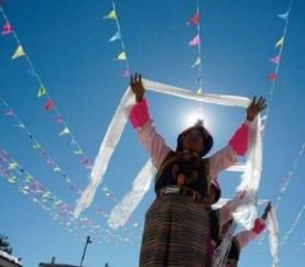 藏族自古崇尚白色,認為白色是純潔、吉祥、誠摯、善良、正義和繁榮的象征。藏族崇尚白色由來已久,先民們把羊毛掛在門楣和各種器皿上;山口、要道的嘛呢石堆上放白色石頭;插箭祭“拉則”(山神的居所)時,在箭桿上系白色羊毛等等,無處不見白色崇拜的印記,藏族居住的青藏高原人們習慣稱做雪域,作為最常見的景物伴隨著民族漫長的歷史,白色更自然地進入藏民族的審美觀念中,滲入藏民族的靈魂深處。