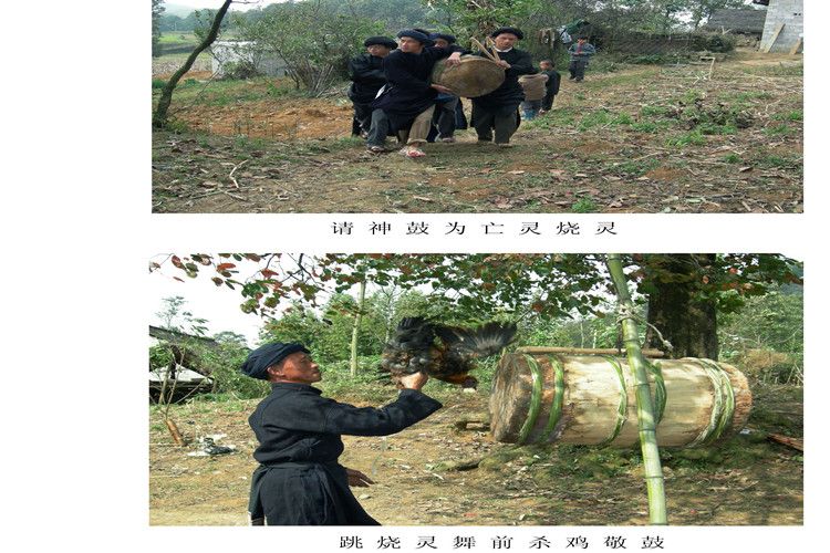 據(jù)苗族民間傳說,楊魯(指苗族祖先)死后,為祭奠他,苗族人民就用楊魯從玉皇大帝那里帶回來的木鼓和蘆笙為他做齋,鳴鼓三聲,吹奏蘆笙震天動(dòng)地,接楊魯回來燒靈,因此鼓和蘆笙成為苗族人民辦喪事的信物,是神靈的象征,以鼓配唱,以鼓配笙吹跳,久而久之形成了苗族祭祀祖先和為亡靈燒靈開道的祭祀性舞蹈——“燒靈舞”。遠(yuǎn)古時(shí)期,苗族是比較強(qiáng)大的民族,苗族的喪葬習(xí)俗,一直受著鬼神觀念的影響,并在意識(shí)形態(tài)深處,打下了深刻的烙印。由此可知,苗族“燒靈舞”源遠(yuǎn)流長,以口傳心授方式代代相傳。