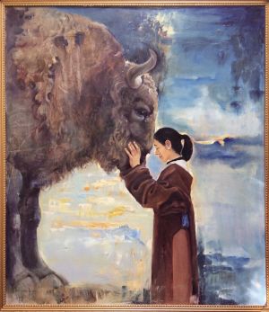 “畫上的牛實(shí)際是我家的一頭老耕牛,名字叫拉洽。它是我們的家庭成員,在收割完青稞的時節(jié),安詳?shù)仉x開了人世?!庇褐易楷斢卯嫻P定格了自己和拉洽惺惺相惜的一幕,這幅作品也感動了西藏牦牛博物館館長吳雨初,后被該館收藏,這也成為舉辦畫展的肇始。