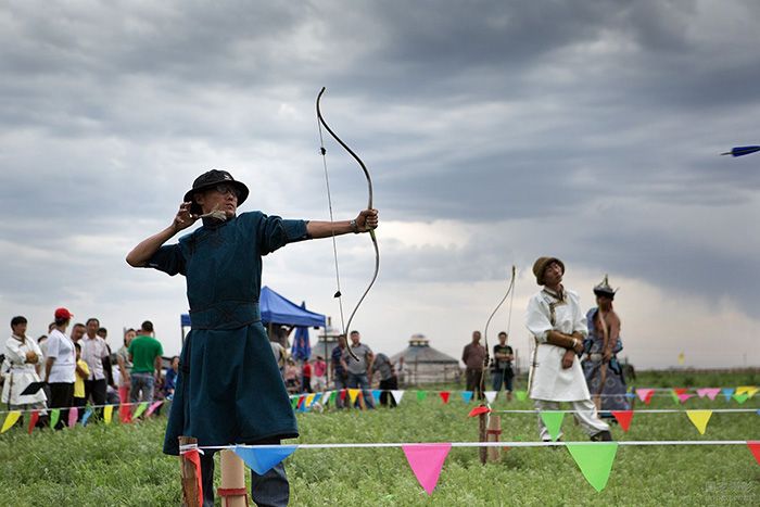 由于在歷史上弓箭是蒙古人生活中不可缺少的武器,人們也就非常尊重那些優(yōu)秀的射手,而射手也樂于當(dāng)眾表演或比賽自己的技藝,因而射箭便成了那達(dá)慕的重要比賽項(xiàng)目。