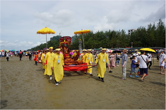 今年適逢中國共產(chǎn)黨成立100周年,活動當(dāng)天,氵萬尾村洋溢著濃濃的愛國熱情。活動開始,身著京族服飾的當(dāng)?shù)卮迕駠墼谄鞐U前,舉行升國旗奏國歌儀式。隨后迎神隊(duì)伍在鑼鼓和鞭炮聲中到達(dá)海邊,將“海神”迎回哈亭敬奉,祈求人畜興旺,五谷豐登(見圖)。眾多慕名而來的區(qū)內(nèi)外游客集聚哈亭和海邊,與京族同胞一起歡慶這盛大的節(jié)日。