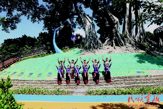 村民在孔雀雕塑下歡迎來(lái)到芒里村的游客。