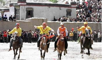 藏歷4月10日到28日,是江孜傳統(tǒng)的節(jié)日—達瑪節(jié),藏語意為跑馬射箭。據(jù)傳說江孜法王繞丹貢桑帕巴桑布,是薩迦王朝的內(nèi)務(wù)大臣,又是江孜法王,在群眾中頗有威望。帕巴白去世后,他的弟子每年做祭祀,以示紀念。后因戰(zhàn)亂,祭祀中斷。至藏歷火鼠年(公元1408年)繞丹貢桑帕任江孜法王,遵其父貢桑帕的遺囑,恢復(fù)祭祀。這一年藏歷4月10日至4月27日,繞丹貢桑帕為其祖父念經(jīng)祭祀,直到28日,開始進行娛樂活動。內(nèi)容主要是曬唐卡畫、宗教文藝活動等。除此之外,還有角力、跑馬、拋石頭等娛樂活動。這些活動,全由法王的部下、兵丁、傭人承辦。從這年開始,固定這段時間為每年一度的祭祀盛典節(jié)日。到了扎西繞丹帕(公元1447年)統(tǒng)轄江孜的時候,娛樂活動更為豐富,除上述內(nèi)容外,還增加了跑馬射箭。于是流行為盛大的江孜達瑪節(jié)。