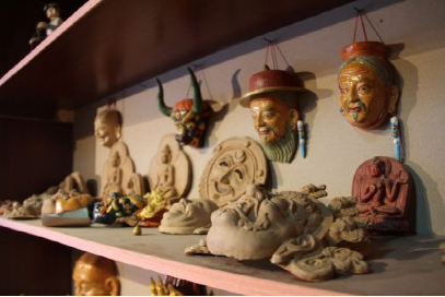 在普布次仁所在的公司里,有一個(gè)專門(mén)用來(lái)制作泥塑面具的房子,從外表上看去,它只是一個(gè)普普通通的藏式民居,但走進(jìn)其中,則別有一番天地。在房間里整齊擺放了大大小小的泥塑面具、佛像,這些手工藝品造型生動(dòng),每一件手工藝品仿佛都在訴說(shuō)著一個(gè)古老、動(dòng)人的故事。