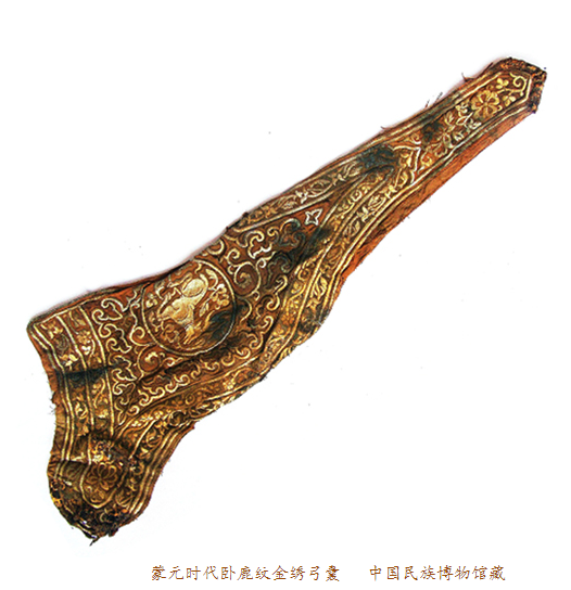 中國民族博物館館藏的臥鹿紋金繡弓囊通長72CM,最寬處25CM,最窄處6.5CM。面料為絹地,呈深褐色。專家推斷其入土前應(yīng)內(nèi)襯樺樹皮或獸皮類框架。弓囊正面以銀裹金錢繡滿圖案,整體金碧輝煌。由于埋藏地下數(shù)百年,弓囊兩端的鐵質(zhì)穿環(huán)和皮條已銹蝕腐爛。