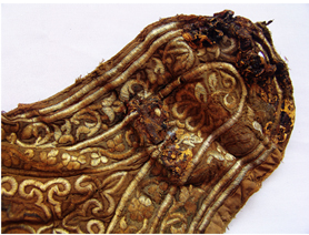 我們?cè)?jīng)描述過元代納石失生產(chǎn)的空前絕后。蒙古民族把對(duì)于黃金的寶愛,傾泄進(jìn)元朝一百年的歷史時(shí)空。在整個(gè)13世紀(jì)的每一個(gè)歷史篇章,都鐫刻著納石失的金縷光影。我們?cè)谑妨侠锟吹?,天子之衣是納石失,天子之裳是納石失,天子之履依然是納石失。那么,蒙元一代,還有什么是用黃金絲線耗盡心血織繡而成的呢?現(xiàn)在,我們看到了這只金繡弓囊。