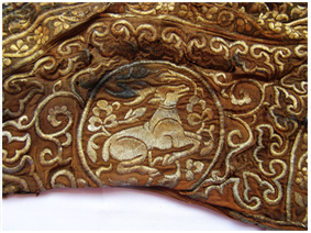 現(xiàn)在,我們就看見一只鹿,靜臥于金繡弓囊的中央。飛揚(yáng)流動(dòng)的黃金絲線勾勒出它宛如花朵一般的角,流露出遠(yuǎn)古神話對(duì)于鹿角神力的幻想和贊美。它以溫柔、嫻靜、優(yōu)美的姿態(tài),安祥地伏于卷草花卉紋中。曾經(jīng)與之相伴的弓影早已遠(yuǎn)去,嗖嗖作響的箭聲也已留在歷史那端。現(xiàn)在,它遺世獨(dú)立。