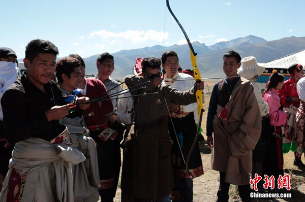 圖為青海省玉樹藏族自州當地民眾進行射箭比賽來慶祝“沐浴節(jié)”到來。來源:中新社 攝影:孫睿