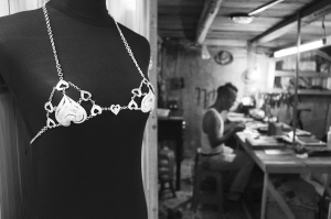 “銀飾胸罩”重約200克。據(jù)龍?zhí)?yáng)介紹,他打制“銀飾胸罩”源于對(duì)妻子的愛(ài)。妻子長(zhǎng)期在田間勞作,夏季汗水貼著內(nèi)衣,悶熱難受。于是,龍?zhí)?yáng)決定給老婆打制一件精致、涼爽的“銀飾胸罩”。這件耗時(shí)33天制成的“銀飾胸罩”,是用發(fā)絲般纖細(xì)的銀絲制成的,穿著舒適涼爽。