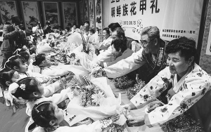 “花甲宴”非常隆重。壽宴當(dāng)日,花甲老人由兒女為其換上嶄新的民族服裝,在洞簫、伽倻琴的伴奏聲中,端坐在壽席中央,接受晚輩們的跪拜大禮。按照傳統(tǒng),花甲老人身后要擺放繪有松鶴圖的屏風(fēng),取長壽之意。屏風(fēng)兩側(cè)手書對聯(lián)“父親的恩情比山高,母親的大愛比海深”,橫批是“某某花甲壽宴”。