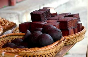 逢年過節(jié)或來了至親好友、土家人的餐桌上往往會擺上一碗血豆腐。血豆腐是土家族傳統(tǒng)菜。用新鮮的豆腐加上干凈的豬血,拌以食鹽、辣椒、花椒、桔皮、肥肉末,用手捏成塊狀,放在柴草煙上熏烤,以表面稍黑,內質稍硬為度。食用時可以切成薄片,加以豬肉爆炒,也可以切成細絲,加上辣椒、香蔥炒制。入口時,令人覺得清香酥軟,大開胃口,是一道下酒佐食的佳肴。