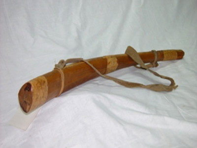 鄂溫克族牛角形帶箍木質(zhì)鹿哨,長71厘米,紅松木質(zhì)地,1946年制作,鄂溫克族傳統(tǒng)擬聲狩獵工具,也作為樂器。征集于內(nèi)蒙古自治區(qū)喀爾古納左旗,藏于民族文化宮博物館。鹿哨是中國北方及東北亞狩獵經(jīng)濟文化類型的重要實物遺存,有鮮明民族與地域特色。
