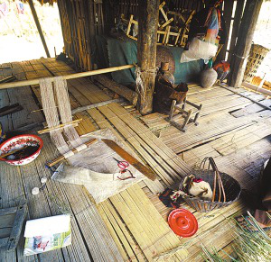 樓上住人、煮飯、貯藏糧食,樓下圈養(yǎng)牲畜。以簡(jiǎn)易板梯上下,有小廊道。室內(nèi)順梁開前后兩道門,中間的通道將屋內(nèi)分成兩部分。右側(cè)為客房,設(shè)火塘,供佛像;左側(cè)為家人臥房,以竹篾隨意分隔,無(wú)門,只擋一布簾,通風(fēng)透光。正門一邊搭曬臺(tái),用來(lái)曬糧、曬衣服和洗漱。住房一側(cè)多建有附房,用以堆柴、舂米、放置生產(chǎn)工具和雜物。