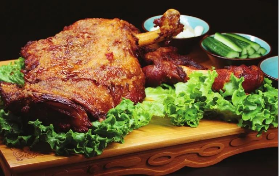 烤羊腿:將綿羊帶骨前后腿肉,配上蔥頭、芹菜和其他調(diào)料烤制而成,外酥里嫩,味道鮮美。食用時佐以黃醬、蔥段和荷頁餅食之。
