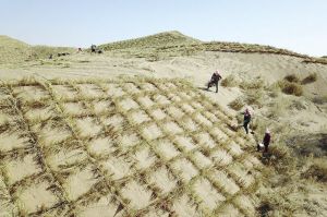 在甘肅省古浪縣北部沙區(qū)旱麻崗治沙點(diǎn),八步沙林場治沙人和群眾一起扎草方格壓沙。 新華社記者 范培珅攝