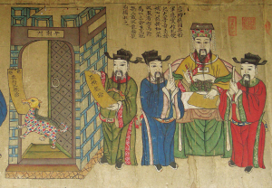 與畬族有關的圖畫主要包括清朝乾隆年間皇家繪制的《皇清職貢圖》,畫內(nèi)有相關的畬族資料和家族祖圖。今藏的祖圖多為清代物品,以麻布、土布為底,平圖勾勒,濃墨重彩,以條狀橫幅長卷居多,也有直幅多屏組合而成的。畫面配有文字說明,圖文并茂,展示了畬族的歷史發(fā)展、社會生產(chǎn)、文化習俗等。畬民家族祖圖分布范圍較廣,主要在福建、浙江、廣東等省。