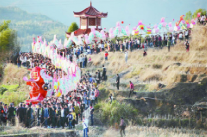 正月十五元宵夜,福建龍巖姑田鄉(xiāng)村,大龍翔游,看客云集。二百多節(jié)、千米長的大龍,蜿蜒于鄉(xiāng)間村野,穿行于大街小巷,騰挪起伏,活靈活現(xiàn);一路上男女老少趨之若鶩,前后左右相隨,游龍隊(duì)伍浩浩蕩蕩達(dá)數(shù)里之長,熱鬧非常;所到之處,家家門前燃松明、點(diǎn)香燭、擺果茶、放爆竹,迎接“龍游大地,喜到人間”。