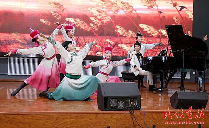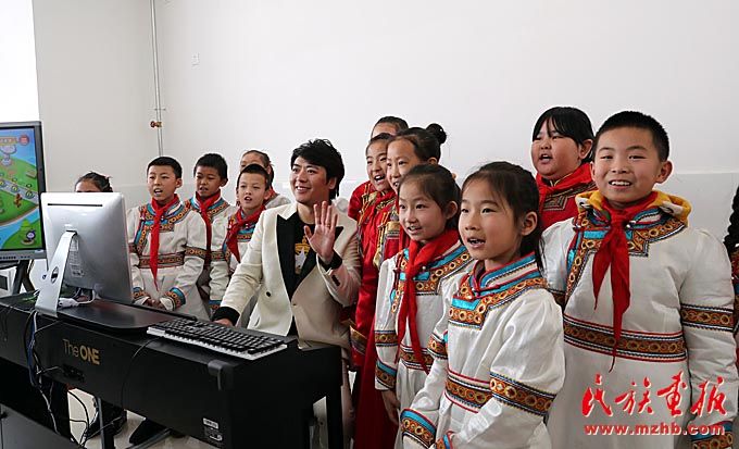 在“快樂的琴鍵”音樂教室捐贈(zèng)儀式上,朗朗與內(nèi)蒙古藝術(shù)劇院直屬烏蘭牧騎演員聯(lián)合表演了《鴻雁》。