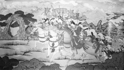 《文成公主進(jìn)藏》及其細(xì)部。規(guī)格:100厘米×60厘米,創(chuàng)作時(shí)間:1985-1993年,作者:夏吾才郎、更登達(dá)吉。這幅作品由夏吾才郎構(gòu)圖,更登達(dá)吉及徒弟上色完成。整幅作品生動寫實(shí)、布局嚴(yán)謹(jǐn)、色彩淡雅、遠(yuǎn)近相應(yīng),呈現(xiàn)出廣泛的視覺空間。 解加馨于供圖
