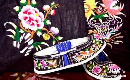 廣南刺繡歷史悠久,遍及壯鄉(xiāng)苗嶺,瑤山彝寨,街頭巷尾,處處都是刺繡的天地。壯族青年婦女的頭飾、圍腰心、圍腰頭、高綁布鞋要繡上圖案裝飾,兒童戴的貓頭帽、花風帽、燕尾帽、月牙帽繡有花邊絲綢,帽前鑲有十八羅漢銀器像,帽的左右兩邊掛有兩串銀器以示吉祥,壯族婦女的外衣繡有三角形、四方形花紋圖案,廣南壯族人民使用的生活用品,如被套、枕巾、桌布、窗簾、手帕以及婦女背小孩的背帶、兒童披風和靈芝鞋等都要繡上花鳥小草點綴,體現出美的情致。