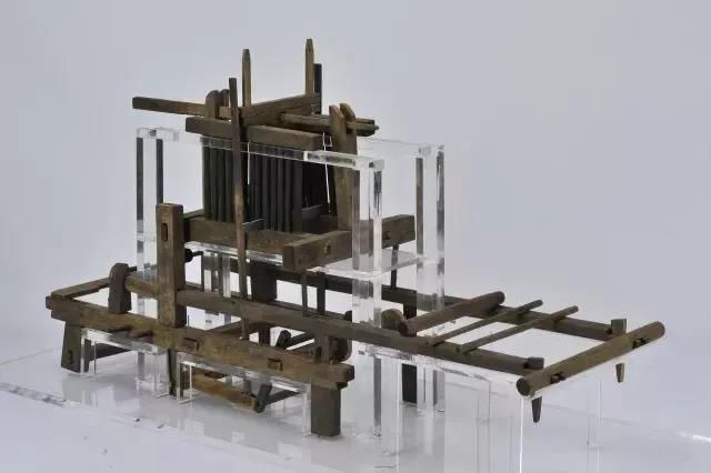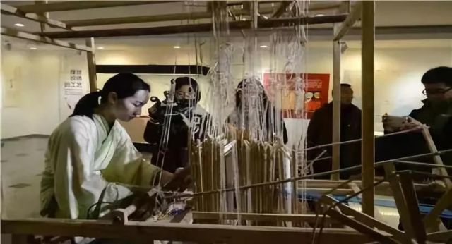 投梭:腳變換著踩豎腳竿將16面綜框輪換升降,雙手左右開(kāi)弓投梭,其間每投一梭要用扣壓緯。