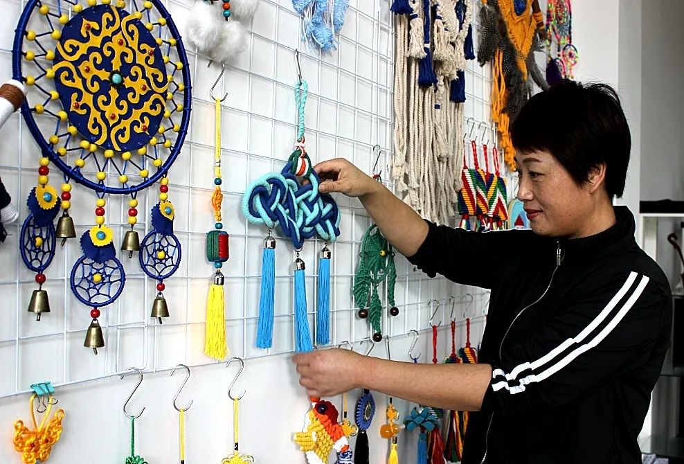 此外,繩結(jié)技藝傳承人把傳統(tǒng)工藝帶去了鄉(xiāng)村,讓傳統(tǒng)手工藝也成為了扶貧的一種助力。她們組織村里的婦女進(jìn)行培訓(xùn)、學(xué)習(xí)。通過手工藝術(shù)村里的婦女們有了生存的技能,目前大多數(shù)村民及貧困戶在第一次培訓(xùn)的基礎(chǔ)上,已經(jīng)充分掌握了繩結(jié)技藝,能夠編織出一個(gè)合格的繩結(jié)產(chǎn)品,變成了名副其實(shí)的“巧娘”。她們扶貧村有協(xié)日塔拉嘎查、四方地村等。