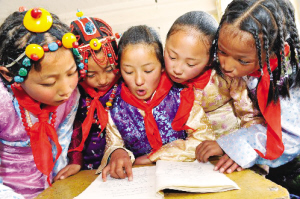 西藏昌都地區(qū)實(shí)驗(yàn)小學(xué)的學(xué)生們在一起念課文