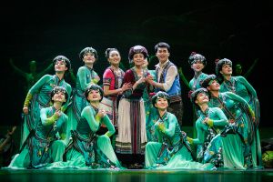 在舞劇敘事方式上,總導(dǎo)演之一董華興將民族性與現(xiàn)代性相融合,嘗試時(shí)空切換,段落重組,故事情節(jié)的倒敘、插敘,真實(shí)性與虛擬性相結(jié)合等方法?!耙魳分谱?、舞蹈語匯、服裝設(shè)計(jì)等方面都要符合當(dāng)?shù)厝罕姷纳?,接地氣老百姓才會喜歡?!薄缎腋;ㄉ健房倢?dǎo)演之一馬文靜說。