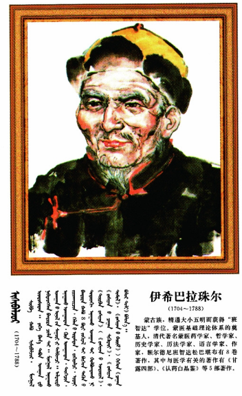 伊希巴拉珠爾(1704~1788),蒙古族,一名也協(xié)班覺、額爾德尼班智達·松巴堪布,蒙古衛(wèi)拉特人,著名蒙醫(yī)學(xué)家、文學(xué)家、天文學(xué)家哲學(xué)家。一生著作豐厚,其中對完善蒙醫(yī)理論體系有重要影響的著作有《甘露之泉》、《白露醫(yī)法從新》、《甘露點滴》、《甘露匯集》和《認藥水晶鑒》,在這些著作中他將藏醫(yī)學(xué)理論與蒙古人的體質(zhì)、生活習(xí)俗、居住地區(qū)的地理、氣候條件等具體實際結(jié)合在一起,進行創(chuàng)造性的理論研究,不僅豐富了臨床實踐的內(nèi)容,而且補充和完善了蒙醫(yī)學(xué)的理論體系,他將傳統(tǒng)蒙醫(yī)學(xué)“寒熱理論”與《四部醫(yī)典》中關(guān)于寒熱病理論的闡述進行有機結(jié)合,使之成為近代蒙醫(yī)學(xué)病性辯證的總綱,同時,他也闡述了將六基癥作為病因鑒別診斷的核心及其臨床表現(xiàn),使“六基癥”學(xué)說從理論到實踐都獲得了比較系統(tǒng)的發(fā)展。占布拉道爾吉是19世紀著名的蒙藥學(xué)家,他編著的《蒙藥正典》(又名嗚嗚蒙藥圖鑒)共收載蒙醫(yī)臨床常用藥物879種,按礦物、植物和動物等分為8部24類,附插圖576幅,對每種藥物的產(chǎn)地、形態(tài)、性味、功能、入藥部分、采集加工、炮制方法、主治、用法等都闡述詳盡,并且每一味藥物都標寫了蒙、藏、滿、漢四種文字的藥名,具有很高的參考價值。該書還附有外科術(shù)療器具圖解,以及放血穴位、針灸穴位、人體各部分劃分圖解說明等。敏如爾古布拉(1789-1838)編撰了蒙醫(yī)學(xué)方劑巨著《方?!?,是一部比較系統(tǒng)完整的蒙醫(yī)藥物方劑學(xué)經(jīng)典著作,收載方劑近200種,分為76章,進行詳盡的論述和評點,同時對相關(guān)疾病的病因、病機、分類和治法等也做了簡要論述。