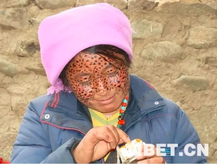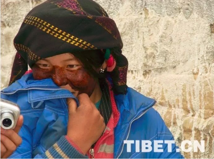 一般情況下,藏北牧區(qū)婦女外出勞作都會(huì)用圍巾將頭部和頸部圍住,這樣既可以保暖御寒又可以抵御強(qiáng)烈的紫外線(xiàn)。而“安達(dá)”可用于涂抹除了眼睛、嘴巴、鼻子外所有臉部區(qū)域。涂抹在臉上的“安達(dá)”自然干了后,婦女們往往會(huì)等到第二天甚至第三天再用溫水洗凈。