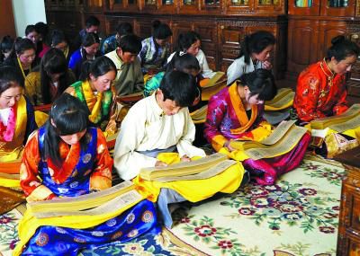 西藏藏醫(yī)學院的學生正在研讀記載著藏醫(yī)藥浴法相關(guān)知識的《四部醫(yī)典》。劉罡 攝