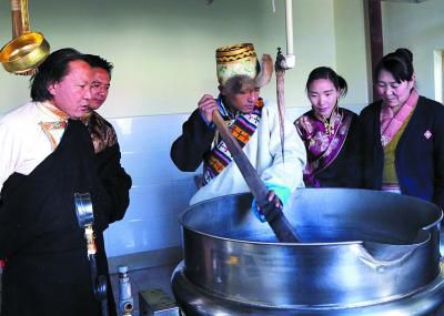 該遺產(chǎn)項目代表性傳承人明珠(左)指導瀧沐覺堪(制藥師)煎熬“五味甘露”。關(guān)確才讓 攝