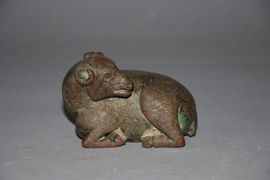 銅羊做蹲臥式,盤角,回首,兩眼凝視,似乎聞聲將起,體型肥碩,神態(tài)溫馴、生動(dòng)活潑,栩栩如生。在鑄造上工匠利用傳統(tǒng)的錯(cuò)金銀工藝,用金絲銀線鑲嵌全身,凸顯出羊首輪廓和纖細(xì)卷曲的絨毛,金光銀彩交相輝映,更顯得生氣盎然。兩漢時(shí)期不但繼承了先秦時(shí)代已有的錯(cuò)金銀技術(shù),而且還有一定的創(chuàng)新,工藝更為精湛。