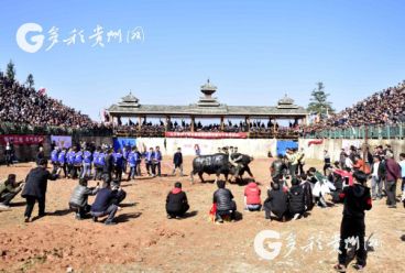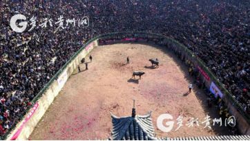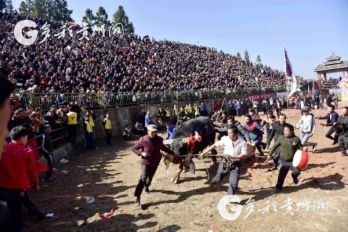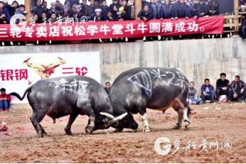 貴州省從江縣第十五屆原生態(tài)侗族大歌節(jié)的前一天,恰逢該縣逢亥斗牛日,丙妹鎮(zhèn)松學(xué)斗牛塘、谷坪鄉(xiāng)四寨河斗牛塘同時(shí)舉辦傳統(tǒng)牛王爭(zhēng)霸賽,喜迎一年一度“侗族大歌節(jié)”的到來(lái),共有來(lái)自周邊村寨的80頭水牯牛參戰(zhàn),斗?;顒?dòng)場(chǎng)上名牛角逐,場(chǎng)面異彩紛呈,吸引數(shù)萬(wàn)名觀(guān)眾前來(lái)觀(guān)戰(zhàn)。