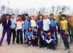 1986年,西藏有了自己專業(yè)的馬術(shù)隊(后排左四為現(xiàn)任西藏競技馬術(shù)隊領(lǐng)隊措東,站立者右二為現(xiàn)任西藏競技馬術(shù)隊教練單增)。