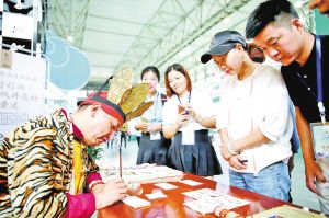 在云南文博會(huì)上,來自麗江的納西族東巴文化傳承人現(xiàn)場展示東巴文字的書寫方法。 張彤?dāng)z