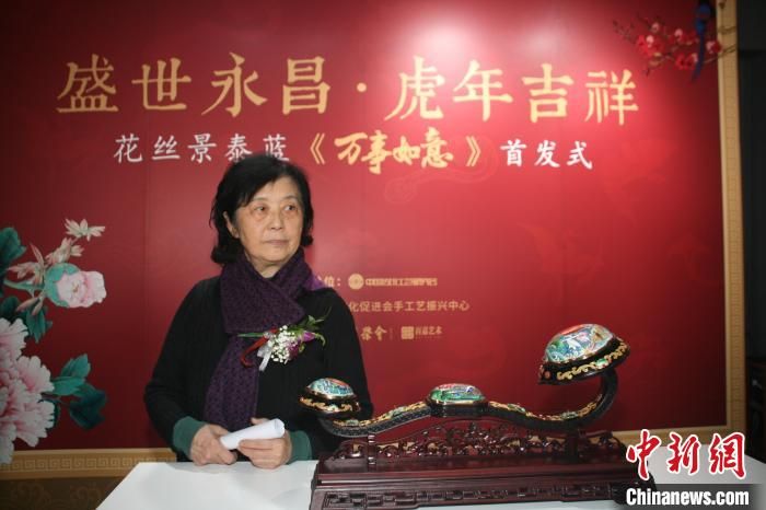 中國(guó)工藝美術(shù)大師程淑美介紹花絲景泰藍(lán)賀歲作品《萬(wàn)事如意》 李妮 攝