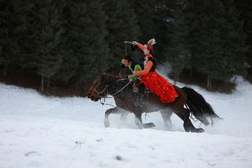 在傳統(tǒng)的竟技比賽場上,最激動人心的還是“姑娘追”它往往是全場比賽的壓軸戲。“姑娘追” 據(jù)說是由上古“追姑娘”的風習演變而來,至今既是哈薩克人最喜愛的娛樂項目,又是小伙子找對象談情說愛的好機會。