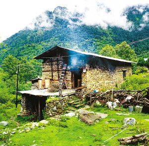 房屋大都是3層,上層存放干草和秸桿,下層關(guān)養(yǎng)牲畜,中間一層是居室。居室用木板隔間,里間較小是已婚子女住的,外間寬敞,是多功能堂屋。臨窗處設(shè)火塘,以利排煙,是家庭生活中心和待客之處?;鹛辽霞苤T大的鐵三角架,上面是六七厘米寬的鐵板圈,擦得錚亮,能烤制食物。墻角處供奉佛像,擺放領(lǐng)袖像。房門(mén)安設(shè)木鎖,用十幾厘米的木鑰匙開(kāi)啟,都是由硬木刻制,光滑耐用。