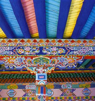 柱頭裝飾包括柱頭、斗拱、大梁等部位的雕刻、彩繪。在藏族居室中柱子、橫梁位置顯要,因此對這部分的裝飾在整個(gè)室內(nèi)裝飾中至關(guān)重要。無論高雅精致的殿堂還是普通百姓的民居都充分認(rèn)識到這一點(diǎn),進(jìn)行合理裝點(diǎn)以求莊嚴(yán)、堂皇、舒適的效果。就拿寺廟集會大堂的柱頭、橫梁來講,裝飾十分考究。天花板下的椽子木頂端整整齊齊地、略有間隔地排列在大梁上方,用彩繪的辦法進(jìn)行裝點(diǎn)。椽子至大梁之間夾著兩道橫杠,其上道用累卷疊函凹凸方格木雕處理,下道橫杠用蓮花瓣依次排列的雕刻或彩繪完成,這種裝飾是約定俗成的,上下圖案不能隨意調(diào)換。橫梁上的裝飾大多采用填充連接長方格來進(jìn)行。橫梁表面劃分大小等同的長方格,這些連接的長方格內(nèi)或填寫梵文經(jīng)文,或繪各種花卉,用這樣的手段裝飾大梁。柱頭與橫梁之間是斗拱,藏族建筑對斗拱的裝飾非常講究。斗拱分兩層,上為長弓,下為短弓。斗拱長短兩弓本身形狀要精心雕摟,其表面也用雕刻著色的辦法加以渲染,以求良好的裝飾效果。斗拱裝飾有簡有繁,最簡單的斗拱形狀為梯形,這種不加任何雕飾的斗拱多見于底層的儲存室內(nèi)。而寺廟建筑大堂、佛堂之類重要殿堂內(nèi)的斗拱是經(jīng)過精心雕鏤的藝術(shù)品,尤其是斗拱長弓形狀千姿百態(tài),通常見得較多的有祥云狀,此外還有各種花瓣?duì)?,其裝飾效果相當(dāng)強(qiáng)。除了斗拱形狀的雕刻外,表面上雕刻各種圖案獲得錦上添花的效果。長弓中心雕刻佛像,兩邊及邊緣雕刻祥云、花卉、整個(gè)斗拱表面顯得飽滿、大方。柱子、柱頭也是裝點(diǎn)的一個(gè)良好的空間,柱子形狀有圓有方,也有部分多角柱。柱子最上面的部位或雕或繪花瓣,在下是長城箭垛式圖案,這兩樣圖案的下面是短簾垂鈴式圖案,所有柱頭裝飾圖案基本上按此模式制作。除了雕鏤精細(xì)的寺廟大殿柱頭大梁裝飾以外,大量的柱頭裝飾見于藏族民居室內(nèi)。民居室內(nèi)柱頭大梁裝飾的基本走向、風(fēng)格與寺廟裝飾設(shè)有大的區(qū)別,彩繪圖案、顏色運(yùn)用、布局結(jié)構(gòu)除了個(gè)別外,與寺廟裝飾相同,只是民居室內(nèi)柱頭大梁裝飾多半是彩繪,幾乎見不到雕刻,這是經(jīng)濟(jì)條件所限呢還是等級待遇不同不得而知。兩者除了裝飾上的簡繁區(qū)分之外其余部分很好地保持了藏民族建筑風(fēng)格的一同性。